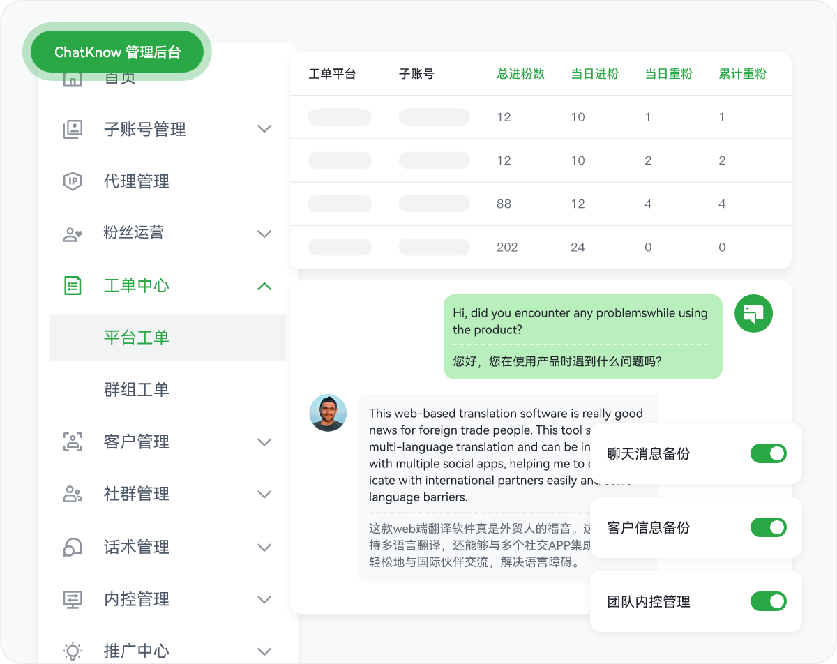 平台对账号聊天数据安全储存,支持追溯聊天内容,并可一键导出。