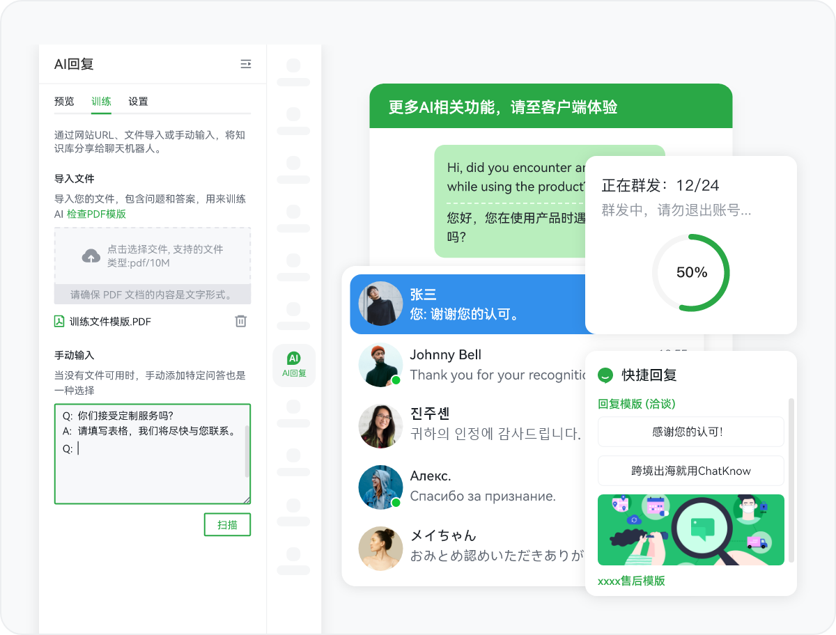 支持员工导入以往的回答记录训练AI, 能够准确理解客户问题的意图,并给出精准的答案。无论是产品信息、使用方法、售后服务政策等常见问题,还是一些较为复杂的技术问题,都能提供专业的解答。